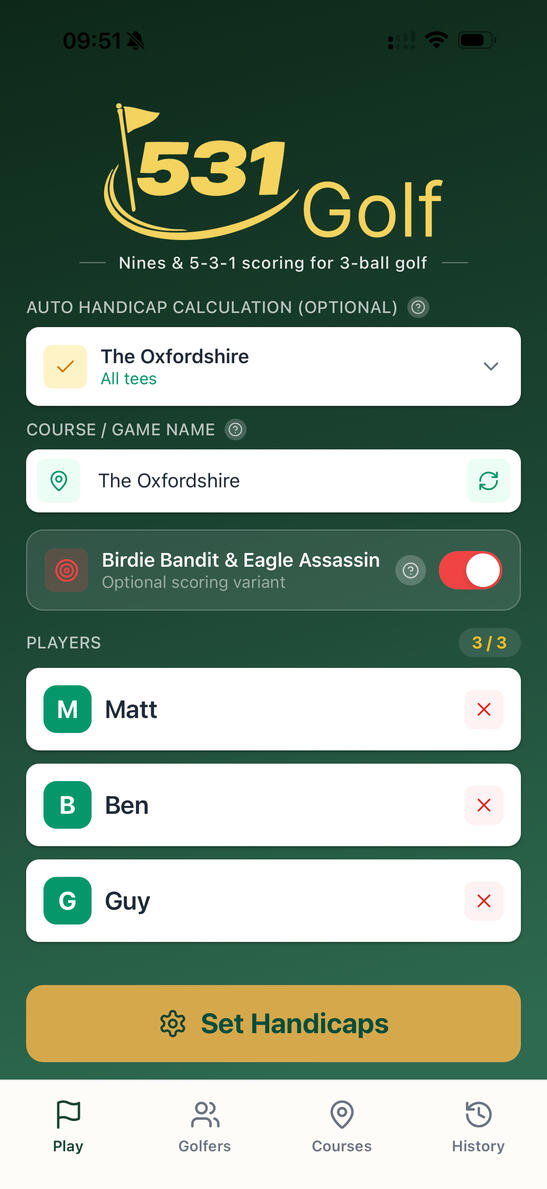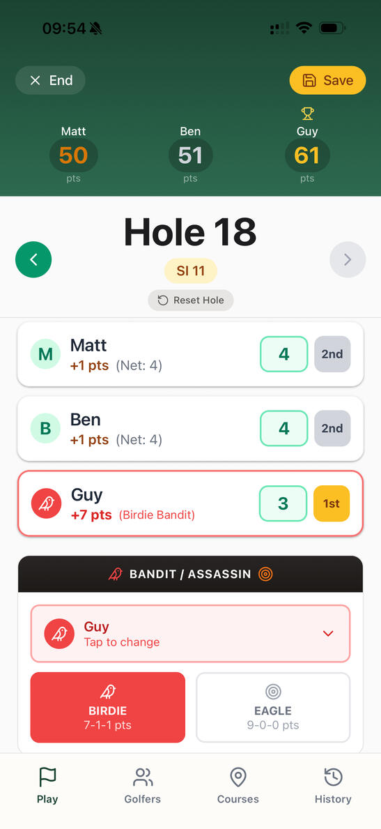 Birdie Bandit and Eagle Assassin mode.Optional bonus gameplay that rewards the only birdie or eagle on a hole - adding an extra spark to the round.So every hole is settled cleanly, the banter stays "friendly", and the competition stays alive until the final putt.If you ever play in a 3-ball, this is the app you want in your pocket.